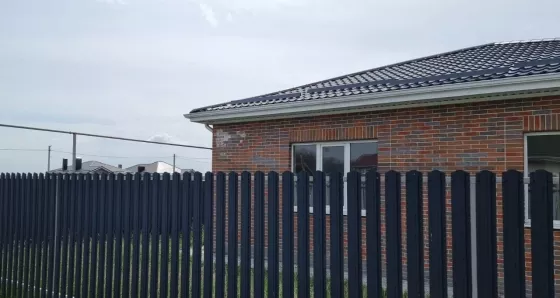 - Прямоугольный ровный участок огорожен забором из профильного листа.