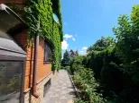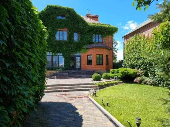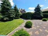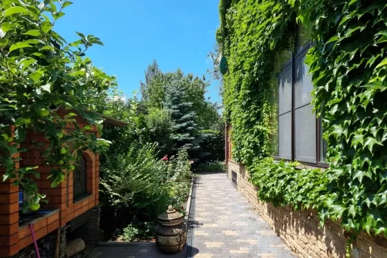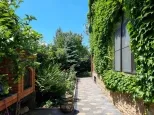 - На участке взрослые декоративные растения, газон с системой автополива, дикий виноград, зона барбекю.