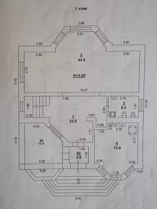 - 1 этаж: остекленная веранда - 11,4кв.м. отдельная кухня 16кв.м, гостиная - 44,5 кв.м, холл - 22кв.м., совмещенный санузел - 5,3кв.м. с душевой кабиной.
