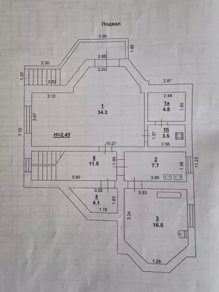 - Цокольный этаж: зона отдыха с бассейном 34,3 кв.м. сауна 4,8кв.м., душевая 3,5кв.м., санузел - 16,5 кв.м., кладовая 4,1кв.м., подсобное помещение 11,5кв.м.